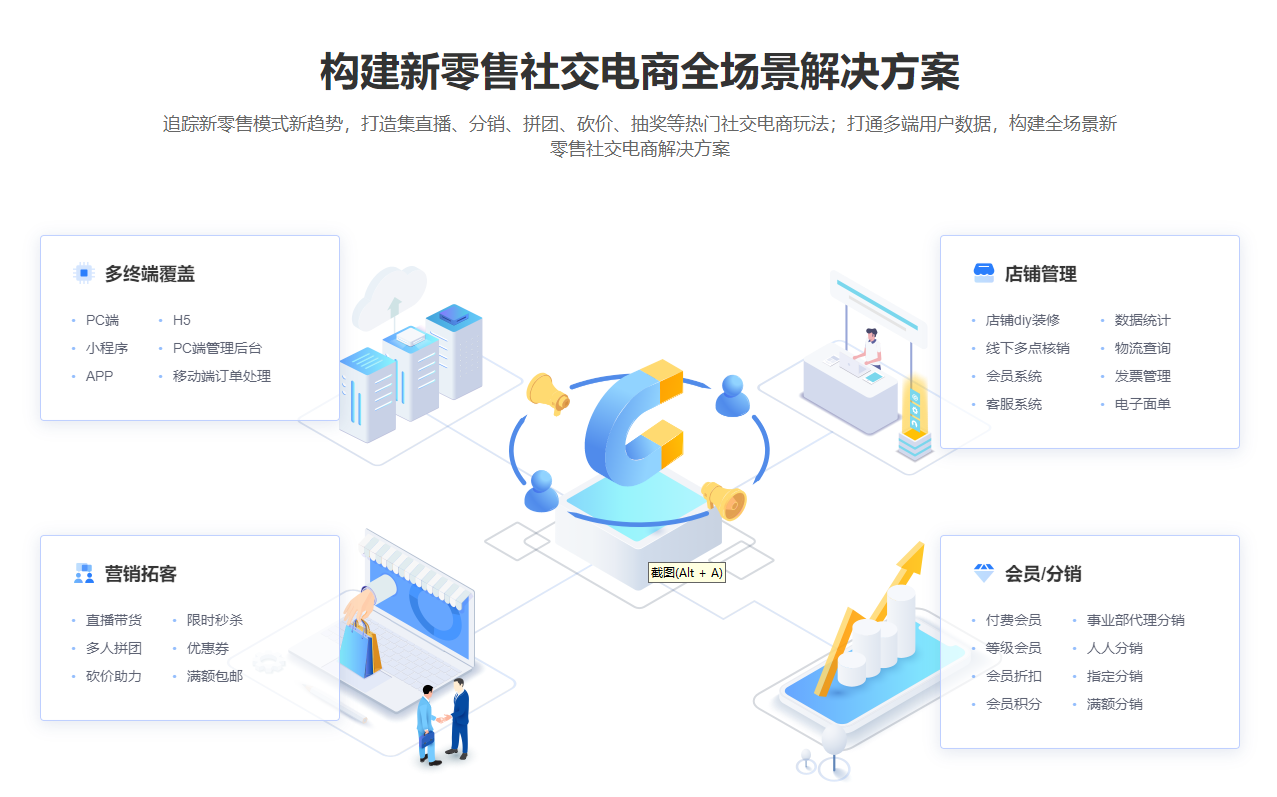 追踪新零售模式新趋势,打造集直播、分销、拼团、砍价、抽奖等热门社交电商玩法;打通多端用户数据,构建全场景新零售社交电商解决方案